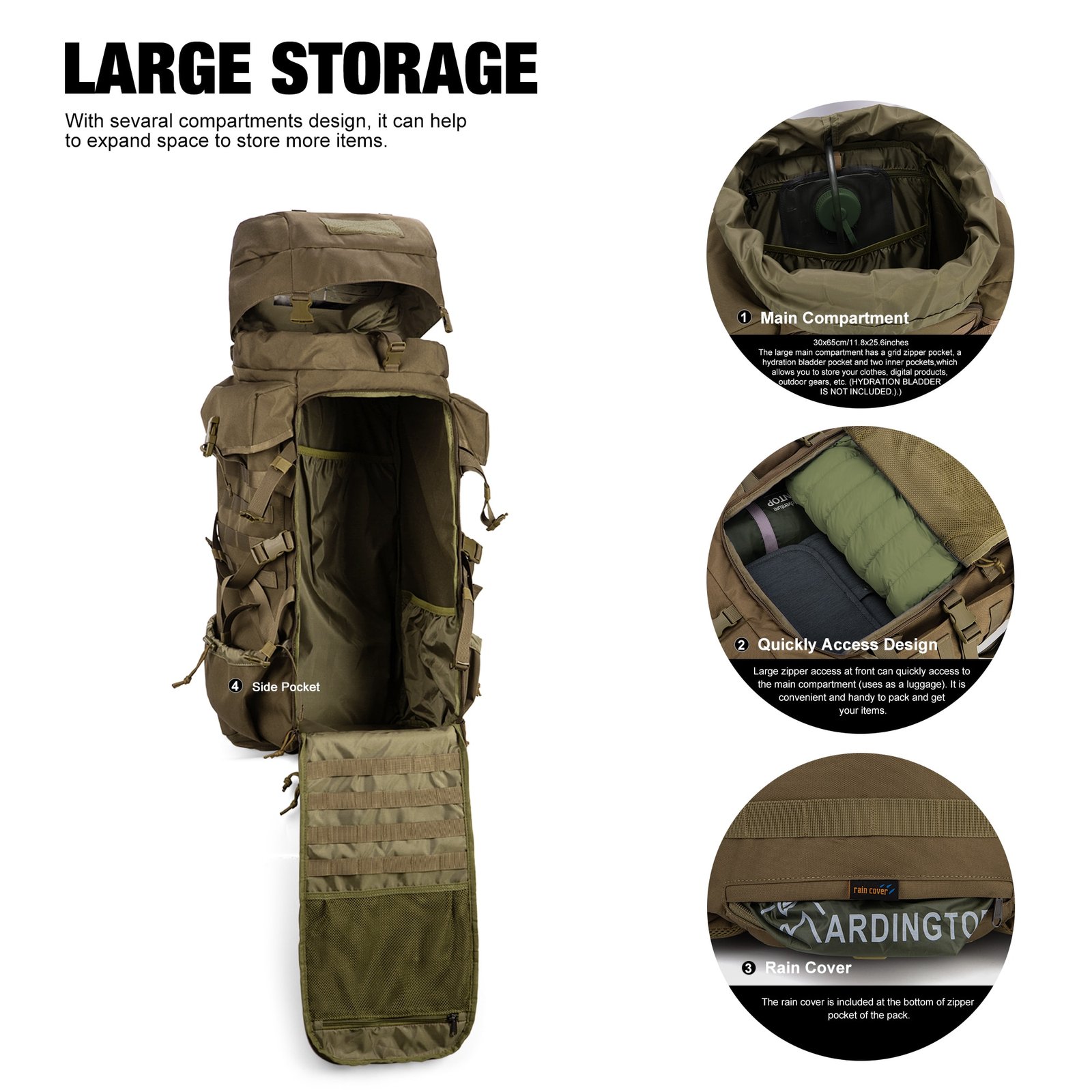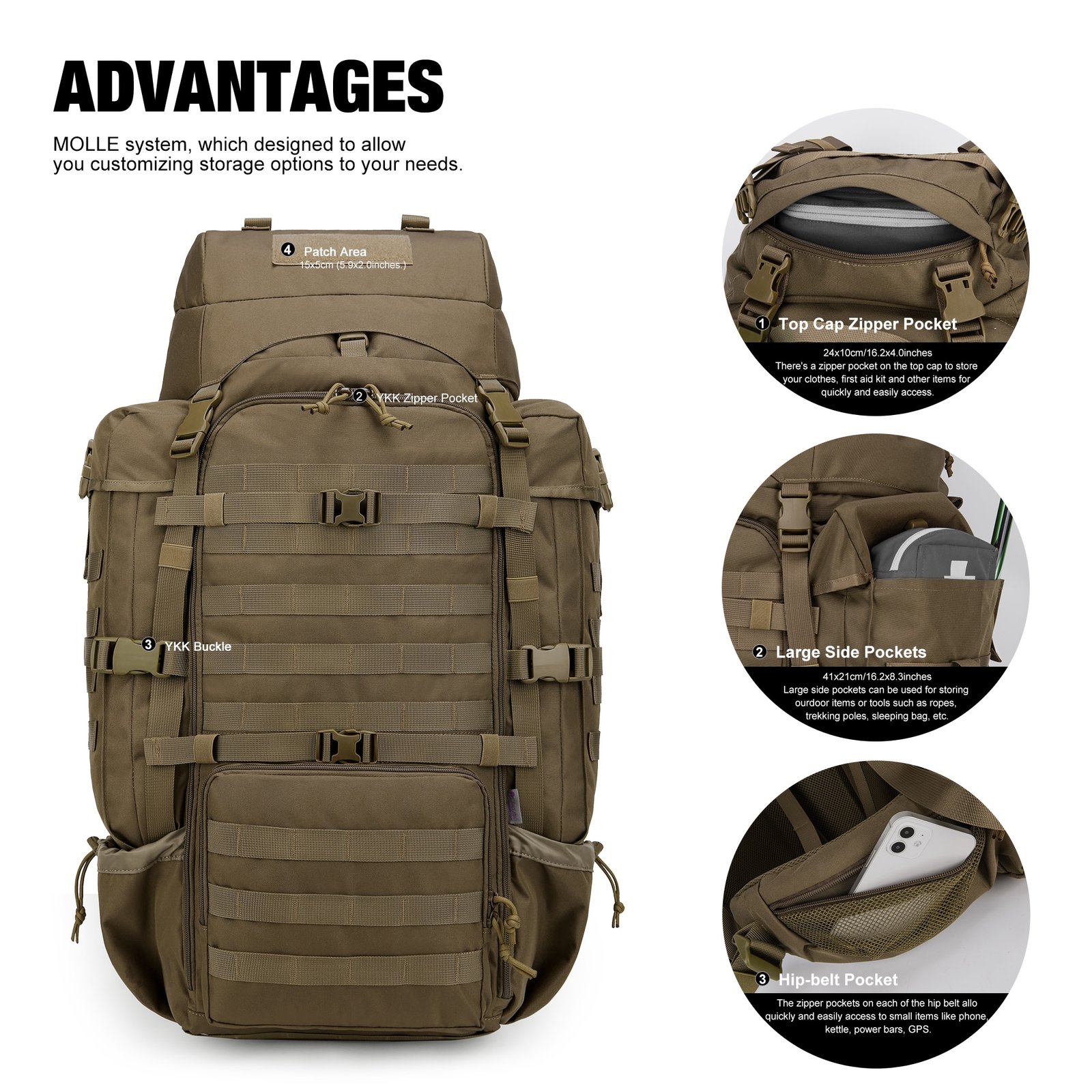 【Large Capacity】- 4271 Cubic Inches features with multiple compartments and pockets. The main compartment has a grid zipper bag, a water bladder compartment, and two inner pockets. It provides ample room for your outdoor essentials including additional clothing, sports towel, maps, etc. The molle system allows you to attach other hiking gear to the pack.