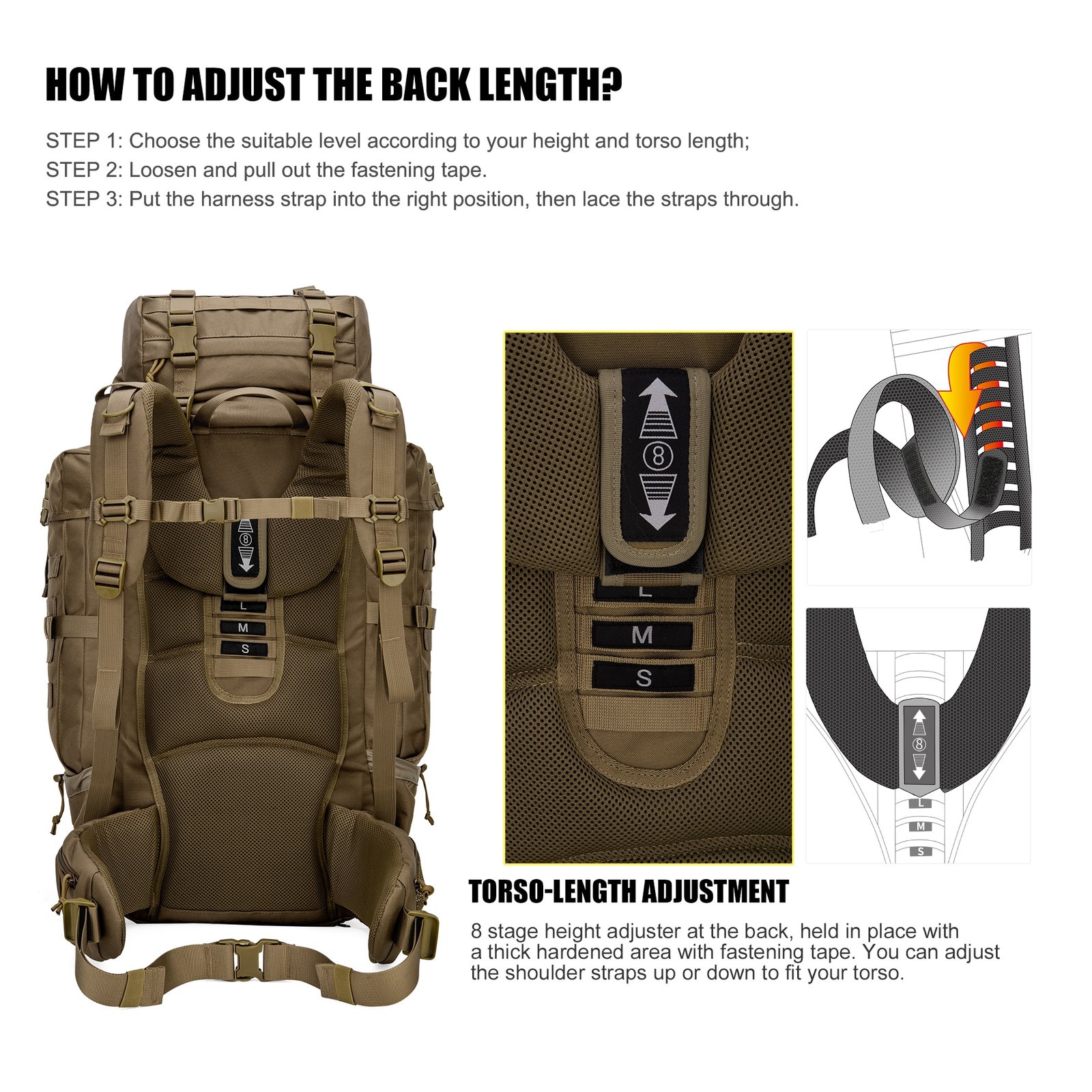 【Customizable Comfort】- Multi-position torso adjustment, adjustable padded sternum strap and hip belt. Breathable mesh bearing system design means this hiking backpack can comfortably fit men and women of different body sizes.