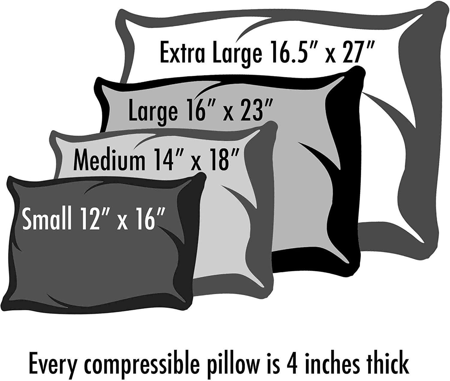 - Pillow measures 14 x 18 x 4 inches (14 x 5 x 6 inches compressed) and weighs 9 ounces; before use, shake and fluff to restore loft; machine washable; made in the USA